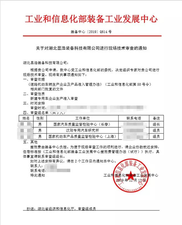 2019年12月19日湖北省顯浩裝備科技有限公司迎來(lái)了工信部委派的三位技術(shù)審查專(zhuān)家,三位專(zhuān)家對(duì)顯浩申請(qǐng)的專(zhuān)用車(chē)企業(yè)準(zhǔn)入進(jìn)行現(xiàn)場(chǎng)技術(shù)審查。依據(jù)《道路機(jī)動(dòng)車(chē)輛生產(chǎn)企業(yè)及產(chǎn)品準(zhǔn)入管理辦法》(工業(yè)和信息化部第50號(hào)令)經(jīng)過(guò)三天的嚴(yán)格審查。專(zhuān)家對(duì)顯浩在送血車(chē)、檢測(cè)車(chē)、監(jiān)測(cè)車(chē)、冷藏車(chē)等專(zhuān)用車(chē)的研發(fā)、生產(chǎn)、銷(xiāo)售、售后服務(wù)等能力方面給予高度認(rèn)可,并一次性通過(guò)了現(xiàn)場(chǎng)審查。隨后將審查情況及材料匯報(bào)國(guó)家工信部專(zhuān)家組審查。