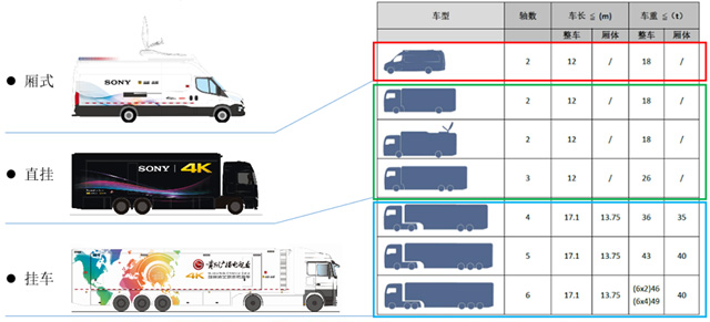 廂式轉(zhuǎn)播車尺寸多依賴于廂式底盤的原有尺寸和載重,配備4~8訊道;操作簡(jiǎn)便、靈活、機(jī)動(dòng)性強(qiáng),不受大型貨車限行影響,對(duì)駕駛員要求不高,有的甚至C本就可以駕駛,對(duì)于小規(guī)模的節(jié)目制作尤為便利。3噸~7噸, 有的車型載重太小,很容易超重;廂式車內(nèi)高通常在1.8米~2米,選擇帶空氣懸掛的,不過(guò)有些底盤尤其是客車類底盤,空氣懸掛太軟,也是不太推薦的。