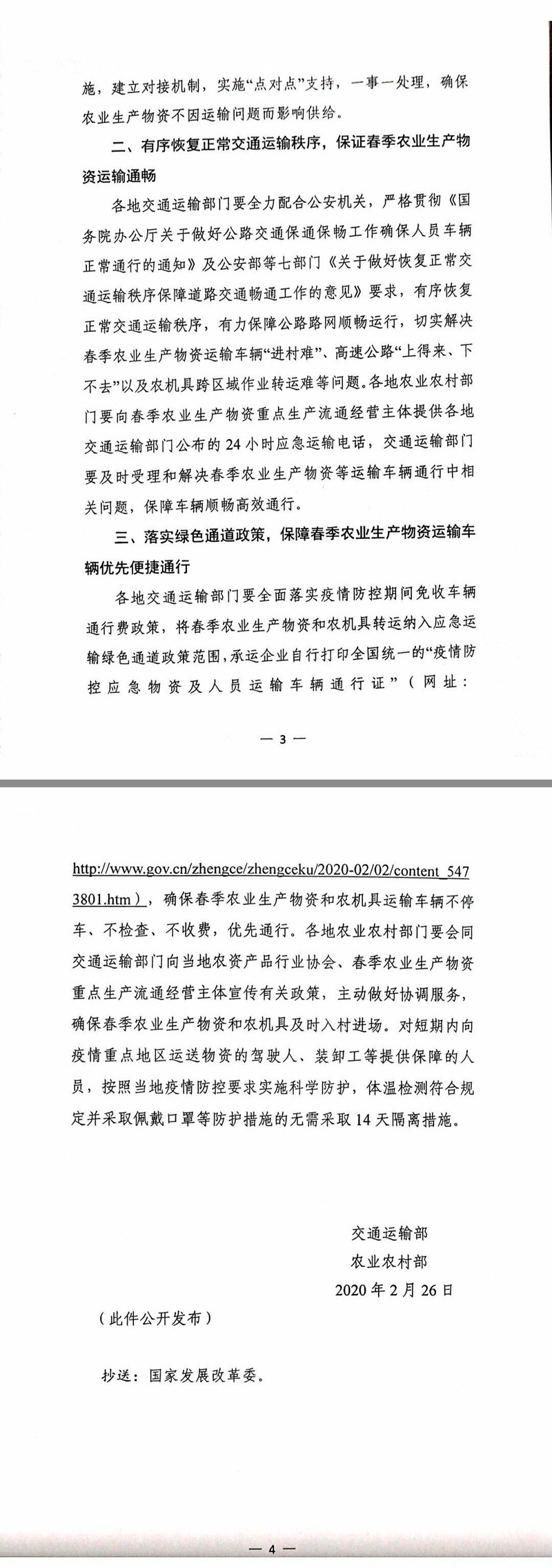 2月26日,交通運輸部、農(nóng)業(yè)農(nóng)村部聯(lián)合印發(fā)緊急通知,要求各地交通運輸、農(nóng)業(yè)農(nóng)村部門認真貫徹落實習近平總書記關(guān)于全國春季農(nóng)業(yè)生產(chǎn)工作的重要指示精神,按照黨中央、國務院決策部署,統(tǒng)籌做好2020年春季農(nóng)業(yè)生產(chǎn)物資(種子種苗、農(nóng)藥、肥料、農(nóng)膜、飼料、獸藥、疫苗、仔畜雛禽、轉(zhuǎn)場蜜蜂、水產(chǎn)苗種、農(nóng)機具及零配件、相關(guān)物資包裝等)運輸保障工作,全力支撐春季農(nóng)業(yè)生產(chǎn),確保糧食和重要副食品安全。
