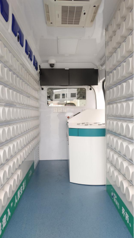移動中藥房車車廂頂部安裝LED滾動屏,顯示接口與發(fā)藥設(shè)備對接,顯示所發(fā)藥品名稱。頂部還安裝紫外燈以便對整個車廂進行殺菌。車輛有GPS,車內(nèi)提供5G(含4G)網(wǎng)絡(luò)連接。配置了駐車空調(diào)和行車空調(diào),以便停車熄火時為車廂內(nèi)提供溫濕度調(diào)節(jié)。